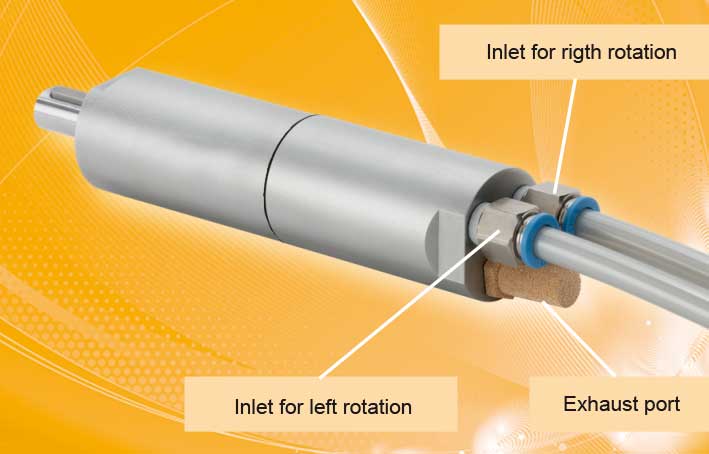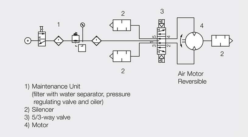 Airmotors that are reversible (i.e. into two turn directions), can also be controlled by a simple flow valve, if the motor contains an integrated, manual reverse lever (for example: POWER LINE high performance motors).