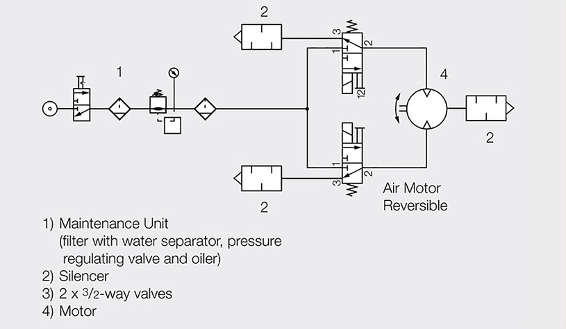 The airmotor can also be used with two 3/2-way valves if operated with reverse: