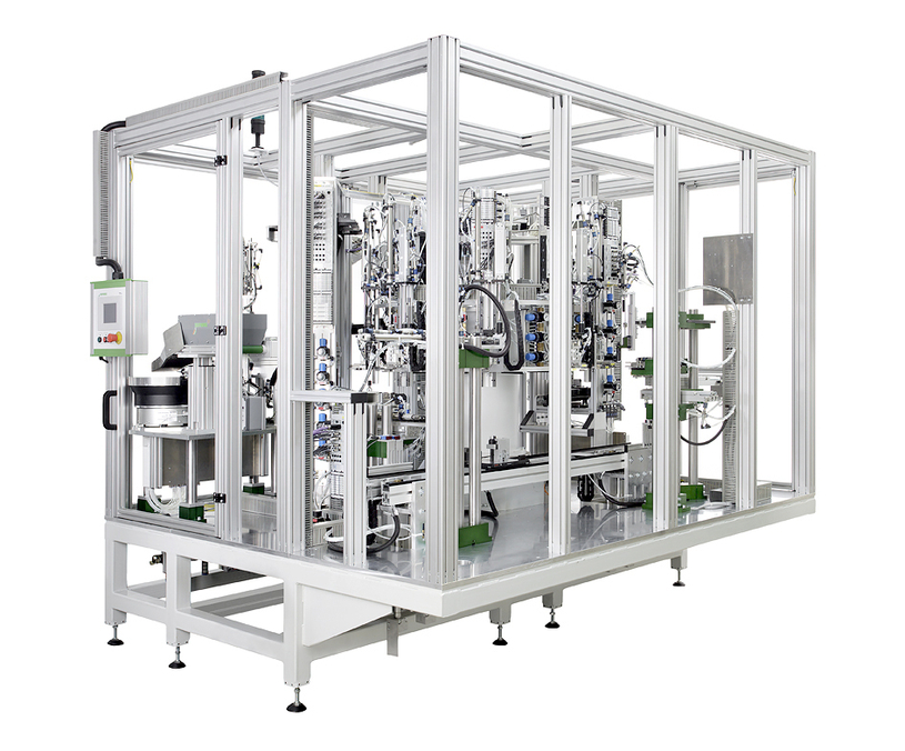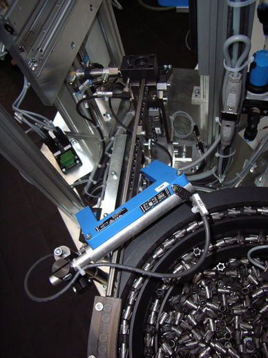 This assembly system incorporated two Vibratory Feeders from the standard DEPRAG program, which are equipped with a part-supervison camera system (recognize the left- or right-handed thread of the carrier) that verifies the position accurate sorting. Two belt driven hoppers with a capacity of 10-liters each assure the optimum part provisioning.