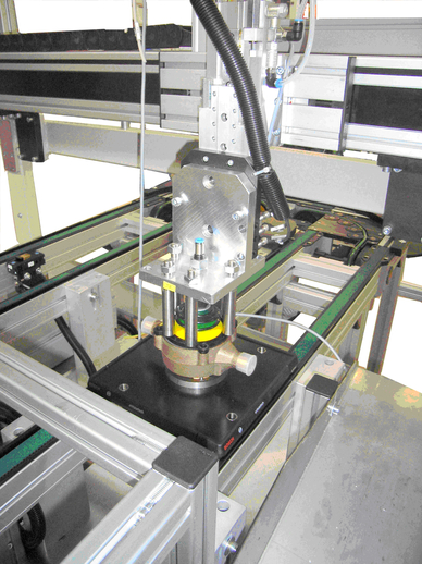 Semiautomatic assembly station for the tightening and pressing of water meter (2 different models with 3 different varieties each) – conveyor integrated.