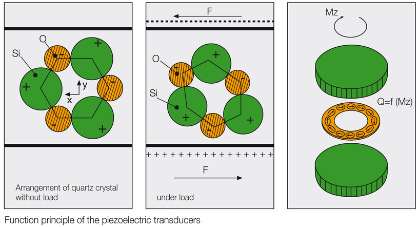 During the Piezo Electric measuring-procedure silicon crystals are elastically deformed, so that an electric load appears on its defined outside surfaces. This load is found to be proportional to the applied force.